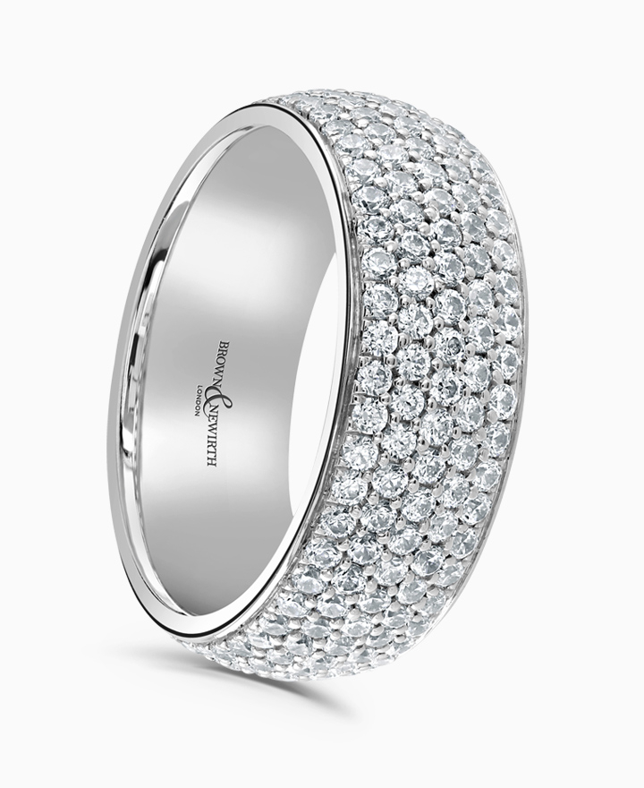 Handcrafted by Brown & Newirth; five rows of round brilliant cut diamonds in a pave setting adorn the full hoop of this classic court band. Total carat weight 2.ct5