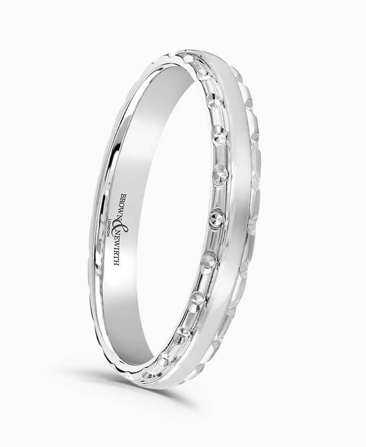 Handcrafted by Brown & Newirth; our classic court profile rolled featuring pearl cut edges, presented in a light gauge.