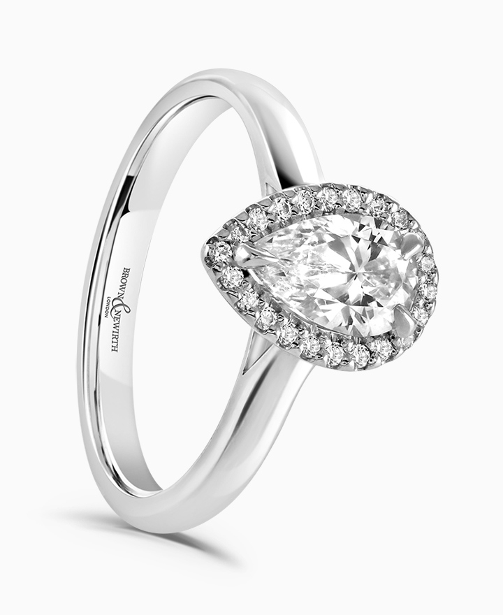 Handcrafted by Brown & Newirth; our signature 'bloom' floral detailing with diamond halo framing a pear cut diamond, presented here on a classic court band. Centre 1.00ct, total 1.10ct. Part of the Bloom Collection.