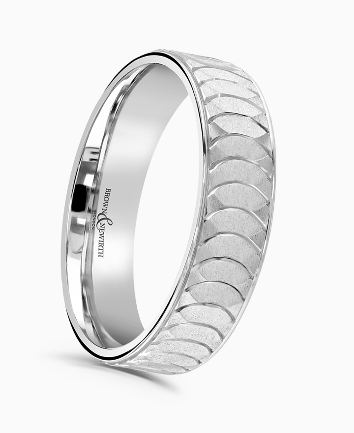 Handcrafted by Brown & Newirth; our flat top profile with brushed half moon centre and contrasting polished drop edges, presented in a medium gauge.