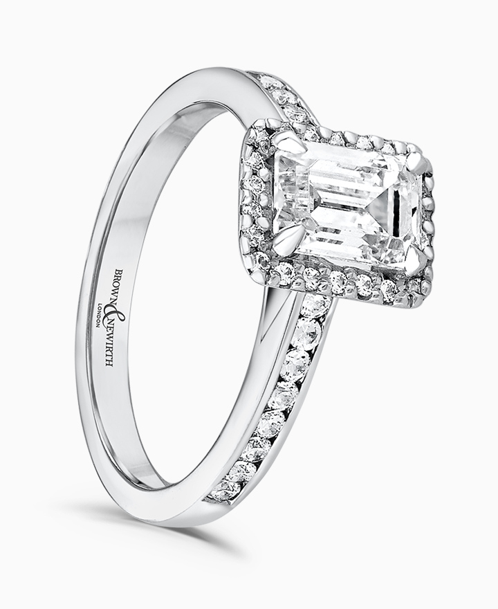 Handcrafted by Brown & Newirth; our signature 'bloom' floral detailing with diamond halo framing a rectangular emerald cut diamond, presented here on a diamond set band. Centre 1.00ct, total 1.35ct. Part of the Bloom Collection.