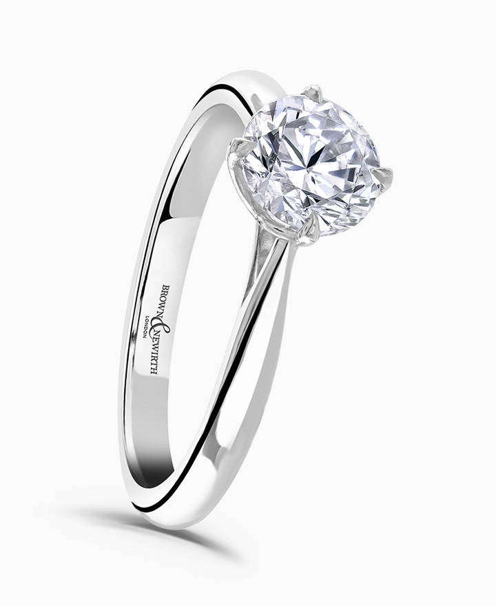 Handcrafted by Brown & Newirth; our signature 'bloom' floral detailing for a round brilliant cut diamond, presented here on a classic court band. From our Bloom Collection. 1.00ct. Part of our in stock range, order today for quick delivery.