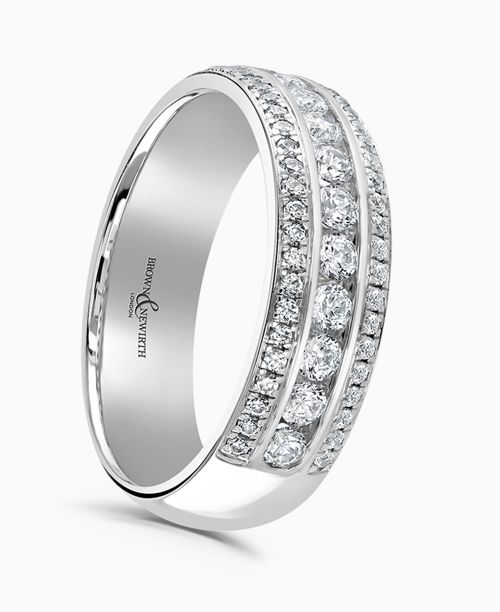 Handcrafted by Brown & Newirth; a triple row of pave set round brilliant cut diamonds adorn 40% of this classic court band. Total carat weight 0.50ct