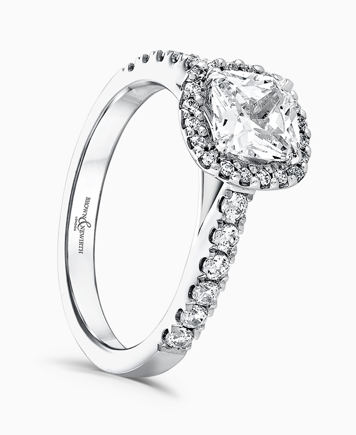 Handcrafted by Brown & Newirth; our signature 'bloom' floral detailing with diamond halo framing a cushion cut diamond, presented here on a diamond set band. Centre 0.70ct, total 1.00ct. Part of the Bloom Collection.