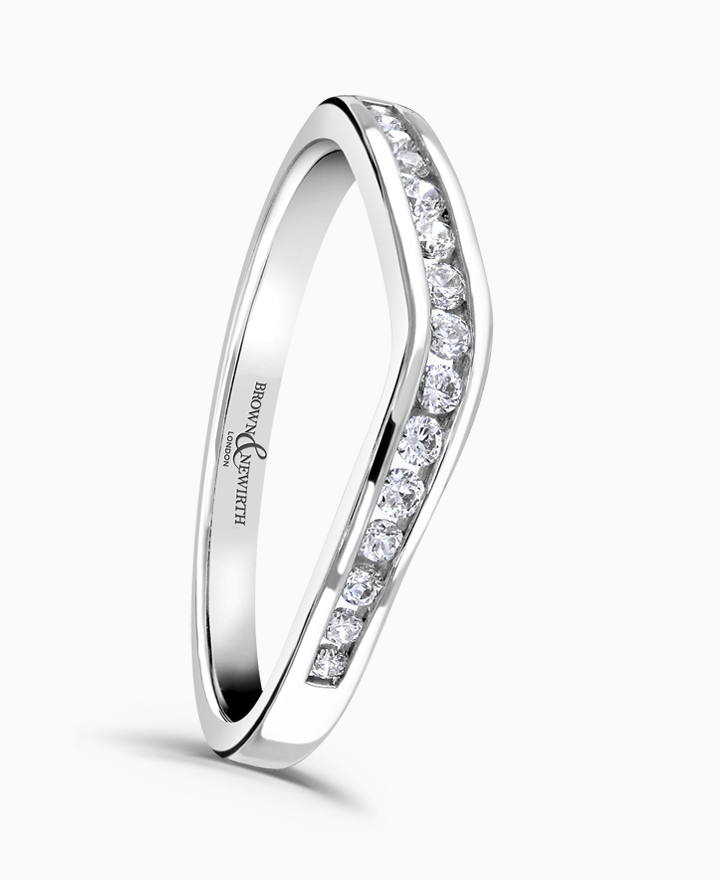Handcrafted by Brown & Newirth; round brilliant cut diamonds flow through a curved top edge adorning of this square edged band. Total carat weight 0.25ct
