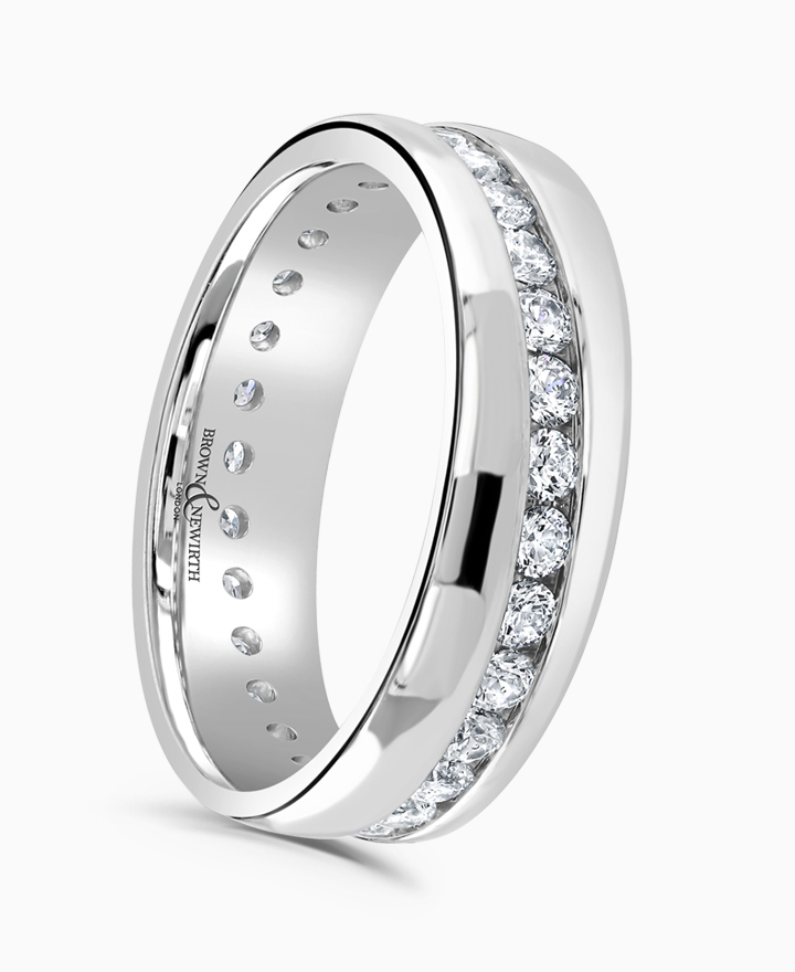 Handcrafted by Brown & Newirth; round brilliant cut diamonds sweep diagonally adorning the full hoop of this modern court band. Total carat weight 0.75ct