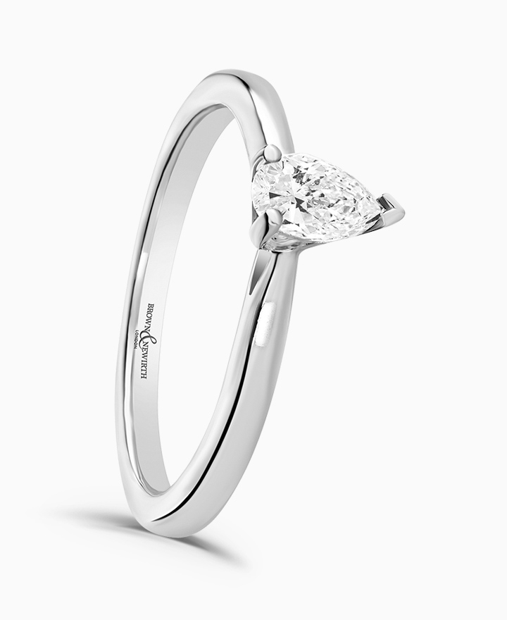 Handcrafted by Brown & Newirth; a delicate four claw setting perfectly elevates the pear cut diamond, presented here on a classic court band. 0.25ct
