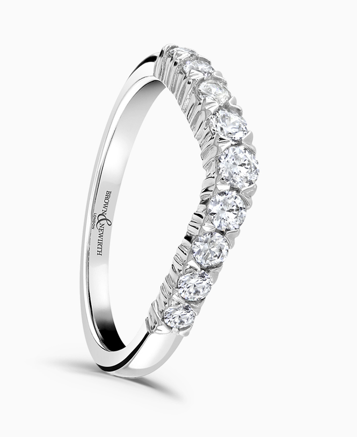 Handcrafted by Brown & Newirth; round brilliant cut diamonds flow through a curved top edge adorning of this square edged band. Total carat weight 0.23ct