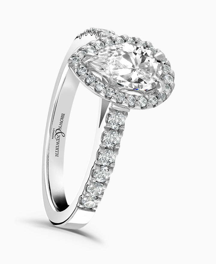 Handcrafted by Brown & Newirth; our signature 'bloom' floral detailing with diamond halo framing a pear cut diamond, presented here on a diamond set band. Centre 1.00ct, total 1.30ct. Part of the Bloom Collection.