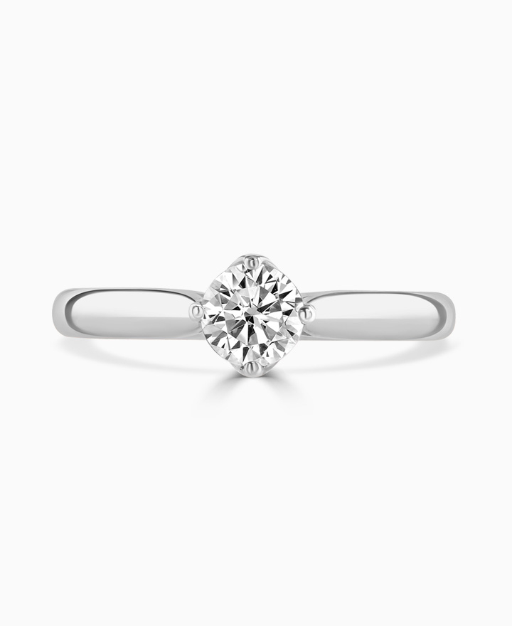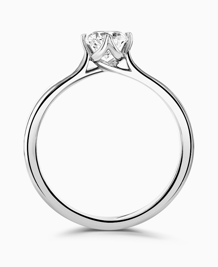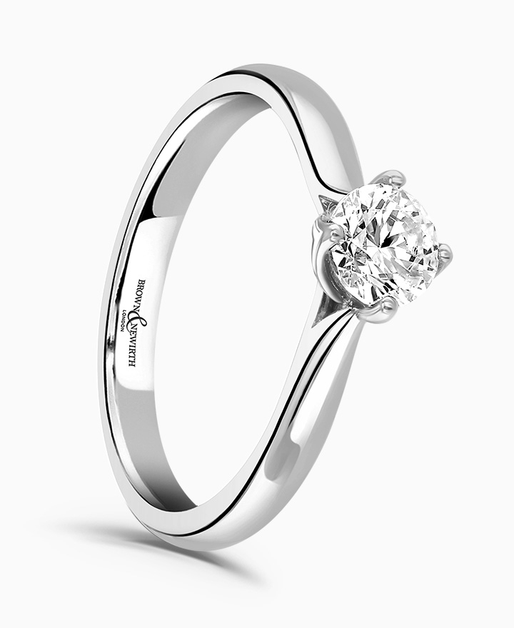 Handcrafted by Brown & Newirth; a symphony of striking lines criss-cross to hold the round brilliant cut diamond, presented here on a straight edged band. 0.50ct