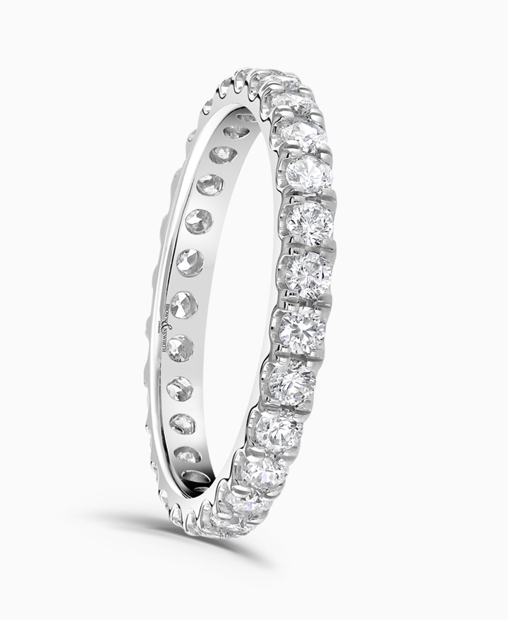Handcrafted by Brown & Newirth; round brilliant cut diamonds adorn the full hoop of this straight edged band. Total carat weight 1.25ct