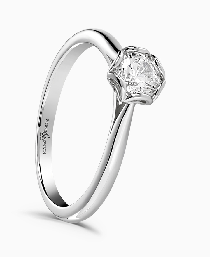 Handcrafted by Brown & Newirth; a delicate four claw setting with floral detailing perfectly elevates the round brilliant cut diamond, presented here on a classic court band. 0.50ct