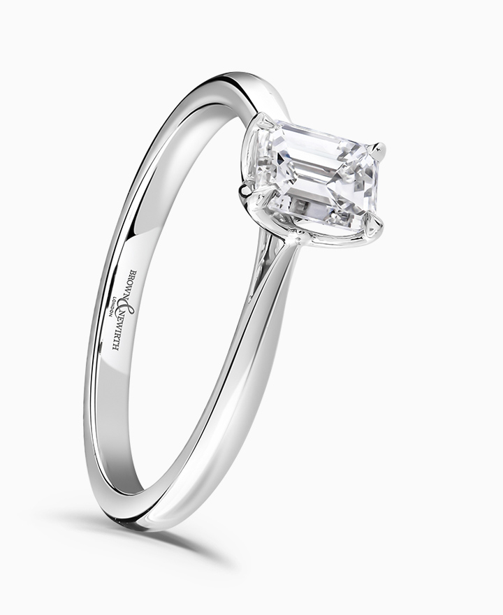 Handcrafted by Brown & Newirth; our signature 'bloom' floral detailing for a rectangular emerald cut G Vs diamond, presented here on a classic court band. 0.70ct . Part of the Bloom Collection.