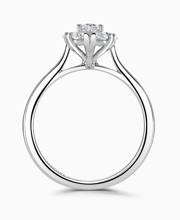 Handcrafted by Brown & Newirth; a delicate elevated cluster setting of round brilliant cut diamonds, presented here on a classic court band. 0.63ct