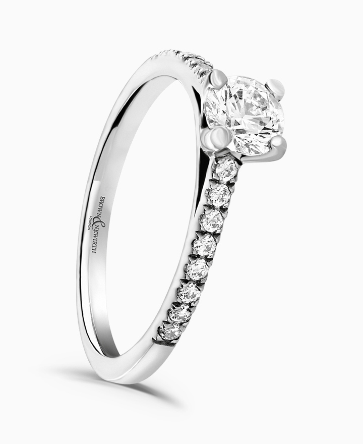 Handcrafted by Brown & Newirth; a delicate four claw setting perfectly elevates the round brilliant cut diamond, presented here with diamond set shoulders. Centre 0.50ct, total 0.66ct.