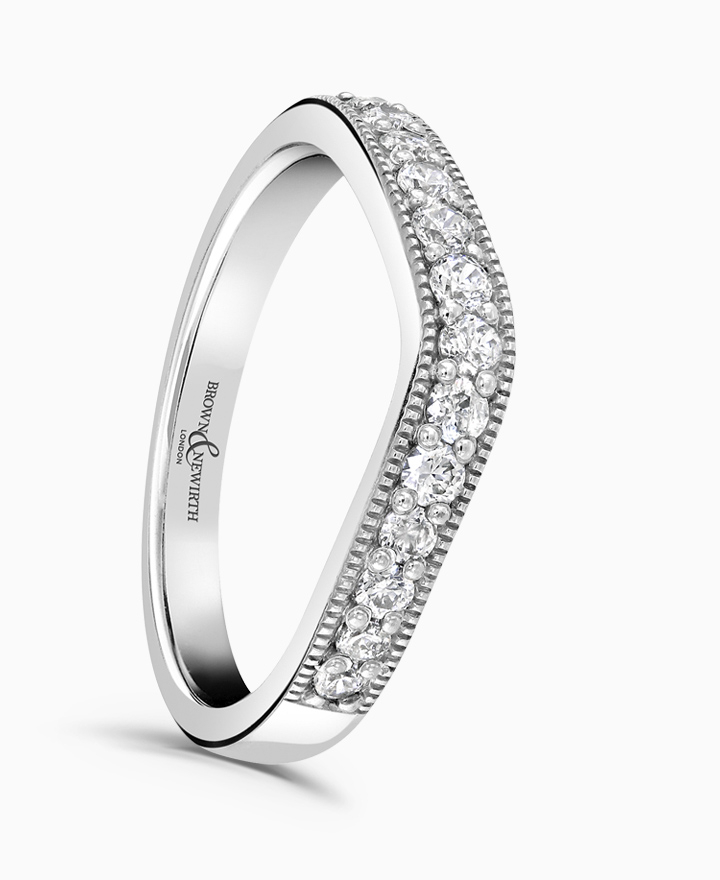 Handcrafted by Brown & Newirth; round brilliant cut diamonds flow through a curved top edge adorning of this square edged band finished with a mill grain edge. Total carat weight 0.20ct