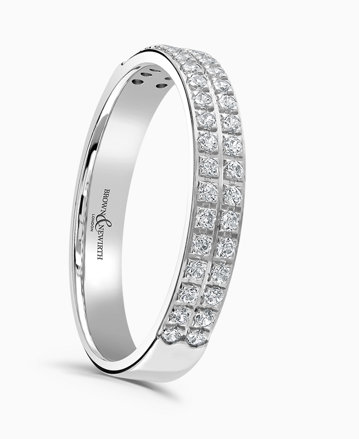 Handcrafted by Brown & Newirth; a double row of round brilliant cut diamonds adorn 50% of this square edged band. Total carat weight 0.25ct