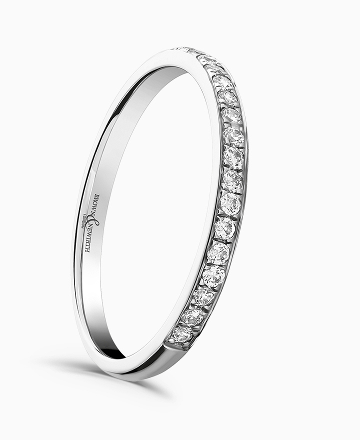 Handcrafted by Brown & Newirth; round brilliant cut diamonds adorn 40% of this classic court band. Total carat weight 0.15ct. This is part of our in stock range, available in platinum & 18ct yellow gold. Order today for quick delivery.