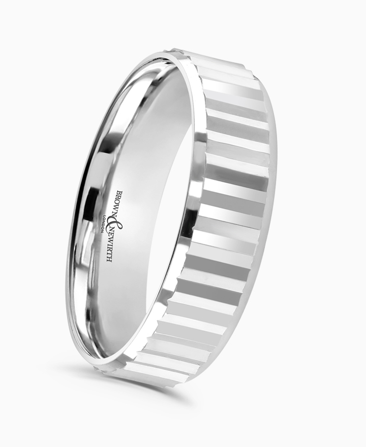 Handcrafted by Brown & Newirth; our flat top profile with v-groove patterning and bevelled edges, presented in a medium gauge. Part of the LOQD Collection