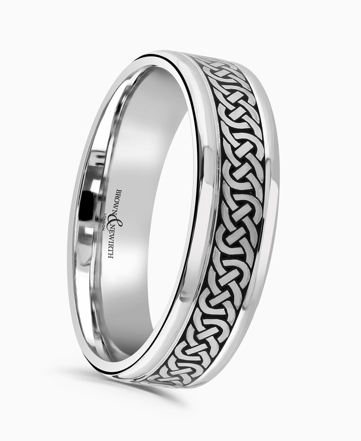 Handcrafted by Brown & Newirth; our flat top profile with Celtic knot detail inlayed with black ceramic, finished with dropped edges. Presented in a medium gauge.