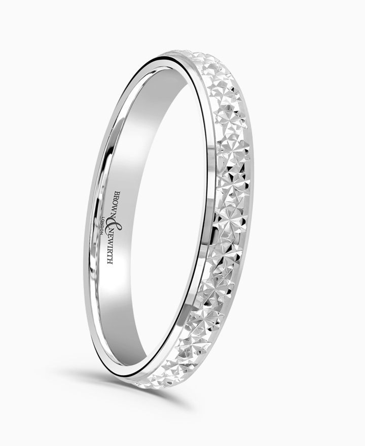 Handcrafted by Brown & Newirth; our classic court profile decorated with a sparkle set centre and dropped rolled edges, presented in a medium gauge.