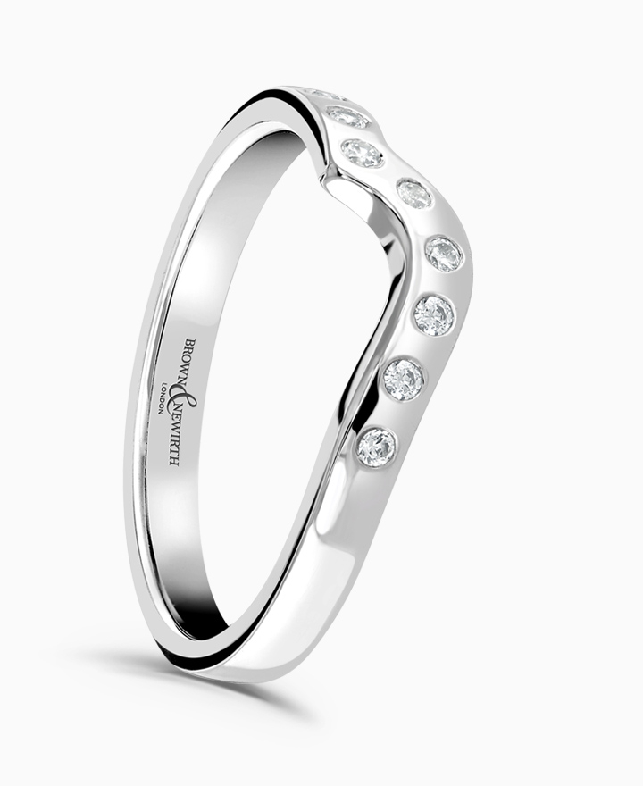 Handcrafted by Brown & Newirth; round brilliant cut diamonds flow through a sweeping curved modern court band. Total carat weight 0.09ct