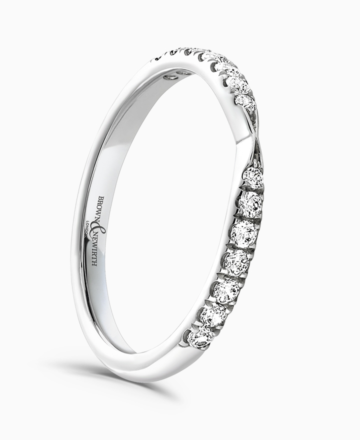 Handcrafted by Brown & Newirth; round brilliant cut diamonds are set either side of the pinch on this bow design, presented on a classic court band. Total carat weight 0.25ct