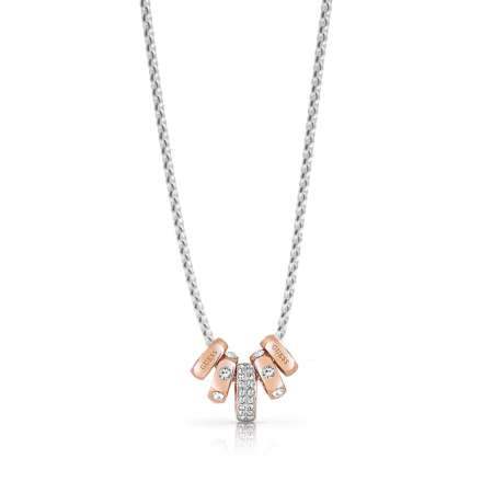 This silver GUESS necklace features 4 Rose Gold studded rings and a crystalised centre ring on a think silver chain.