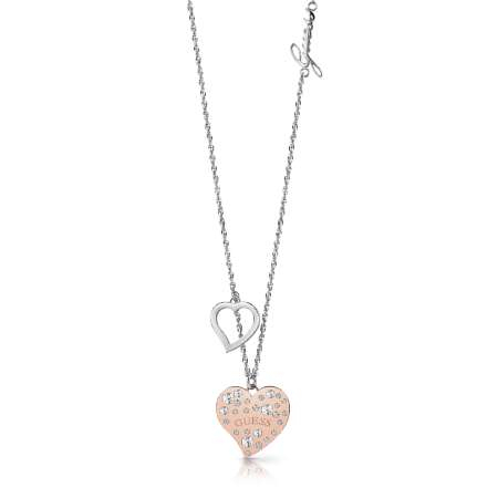 This Silver GUESS twist-effect chain necklace features a logo charm within the chain, an embellished Rose gold heart and a hollow Silver heart charm.