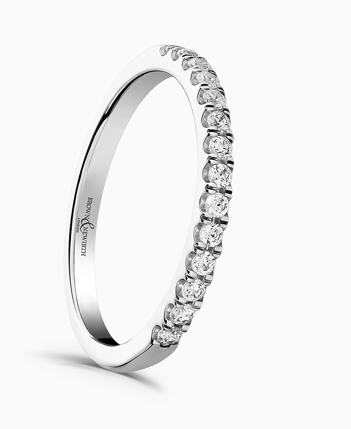 Handcrafted by Brown & Newirth; round brilliant cut diamonds adorn 40% of this straight edged band. Total carat weight 0.20ct. This is part of our in stock range, available in platinum & 18ct yellow gold. Order today for quick delivery.