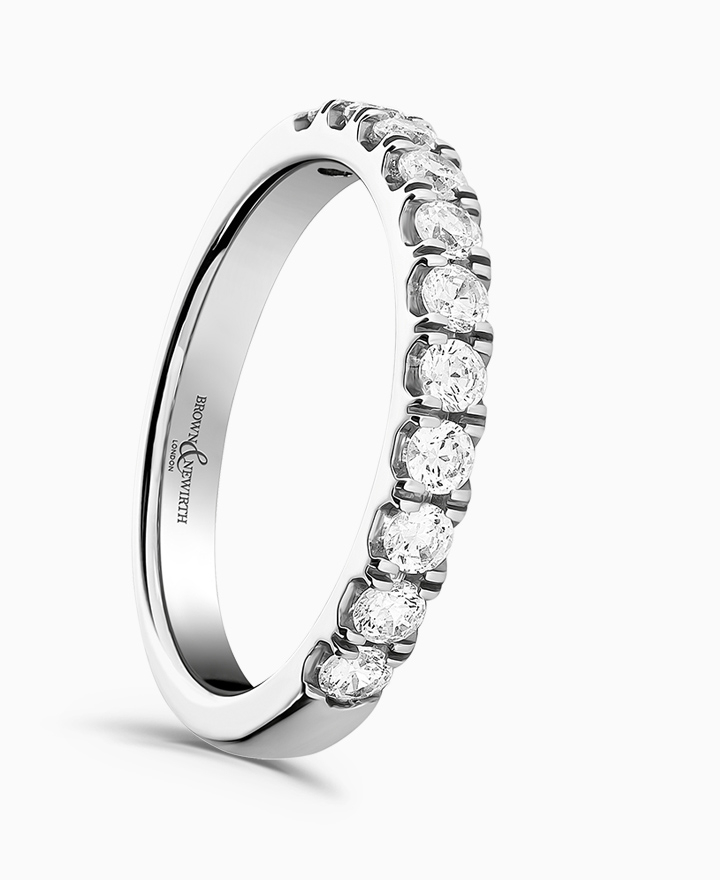 Handcrafted by Brown & Newirth; round brilliant cut diamonds adorn 45% of this straight edged band. Total carat weight 0.50ct. This is part of our in stock range, available in platinum & 18ct yellow gold. Order today for quick delivery.