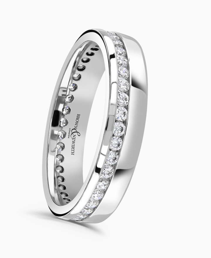 Handcrafted by Brown & Newirth; round brilliant cut diamonds set along the edge adorning the full hoop of this modern court band. Total carat weight 0.50ct