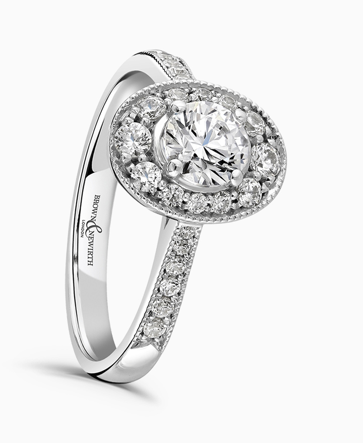 Handcrafted by Brown & Newirth; an oval shaped diamond halo frames the round brilliant cut diamond, presented here with diamond set shoulders. Centre 0.50ct, total 0.80ct. Part of the Vintage Collection
