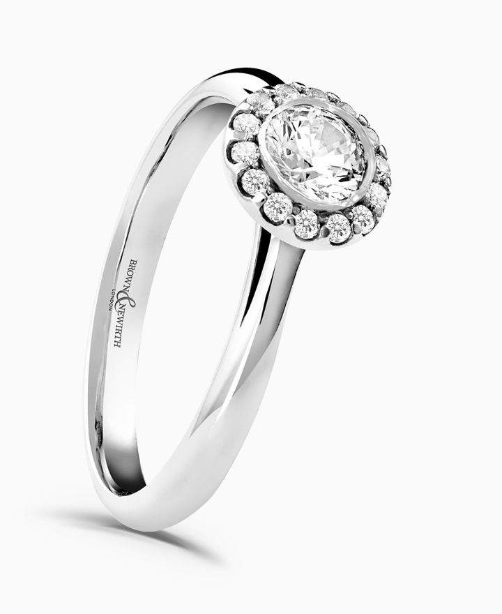 Handcrafted by Brown & Newirth; a diamond halo frames the bezel set round brilliant cut diamond, presented here on a classic court band. Centre 0.33ct, total 0.42ct.