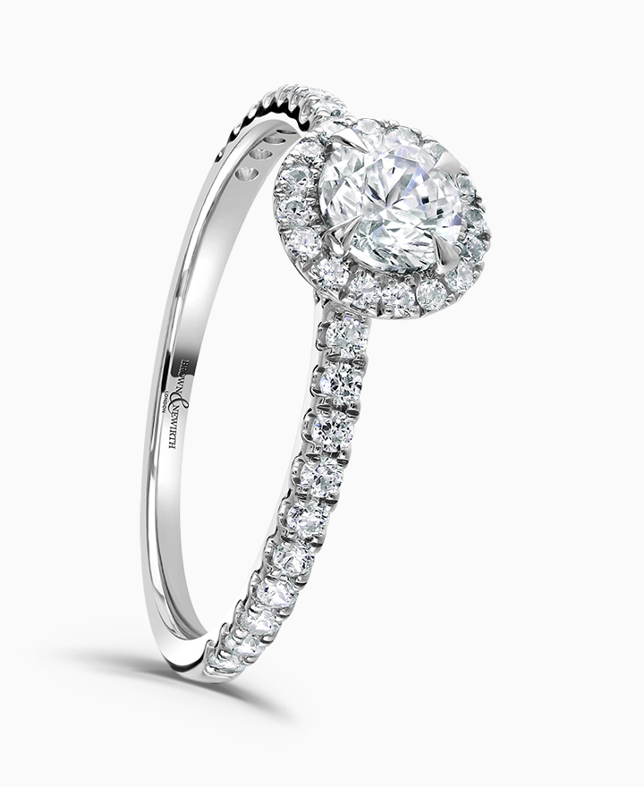 Handcrafted by Brown & Newirth; a diamond halo frames the round brilliant cut diamond, presented here with diamond set shoulders. Centre 0.70ct, total 1.04ct.
